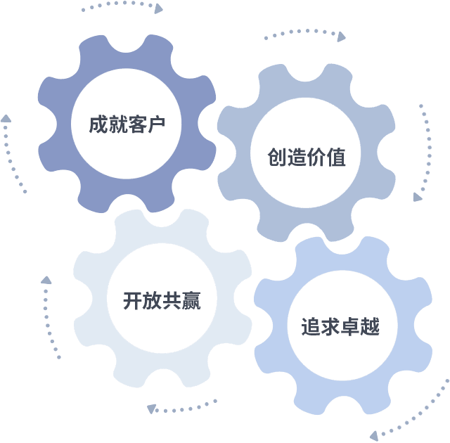 成就客户是一切决策的出发点,,,创造价值是衡量所有工作的标准,,追求卓越是我们做事做人的态度,,,开放共赢是我们的格局也是最终的结果。。价值观的齿轮环环相扣,,,推动着组织里的每个人不断向前。。。。